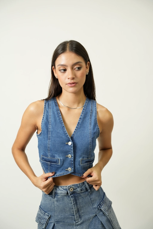 Chaleco corto de mezclilla con botones y simula bolsas al frente