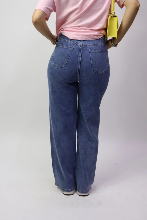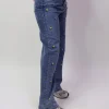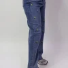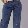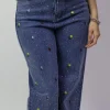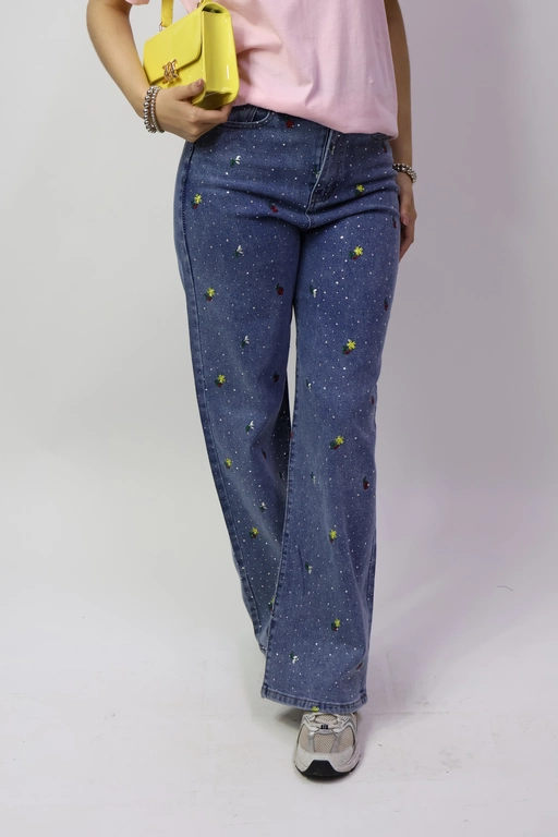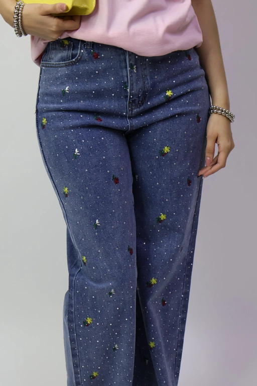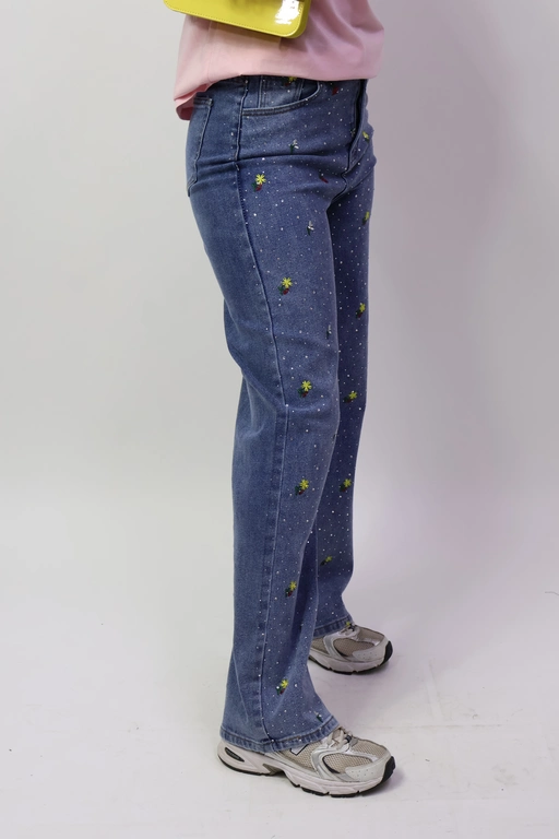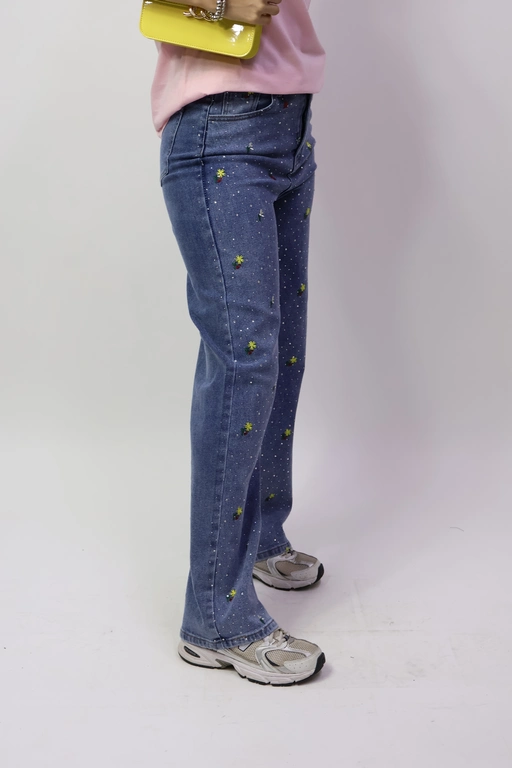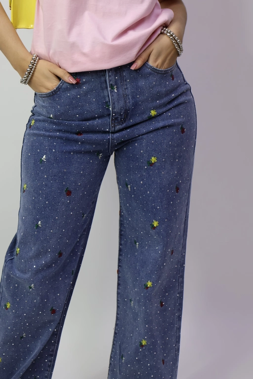 Pantalon de mezclilla con flores bordadas y aplicacion piedras